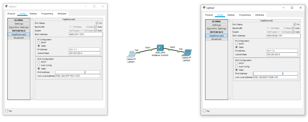 Dưới dây là một network gồm 2 máy nối với nhau bởi switch, ip của 2 máy gán tĩnh dải 10.1.1.x . khi và chỉ khi cùng dải thì chúng ta mới giao tiếp qua đơn đối tượng switch. Đây là concept network switch cơ bản!